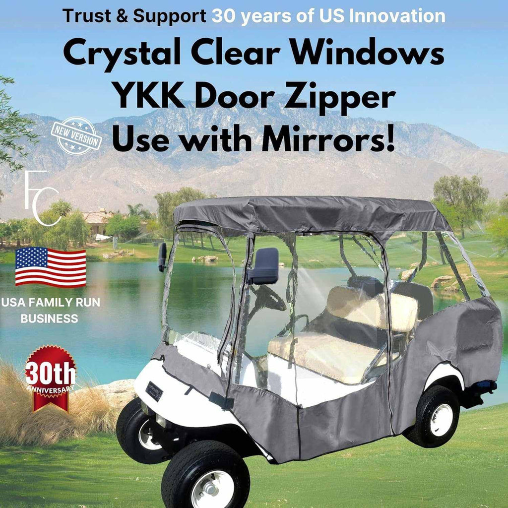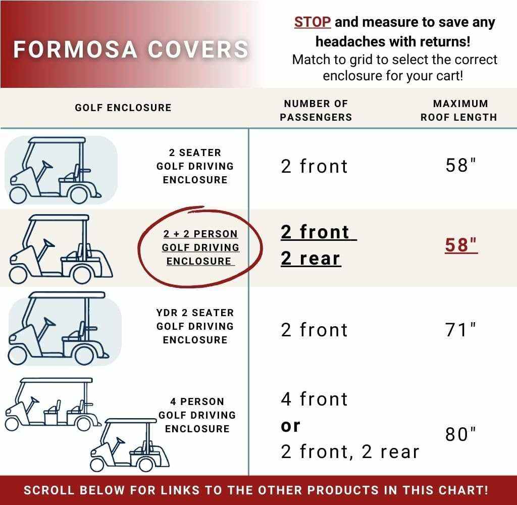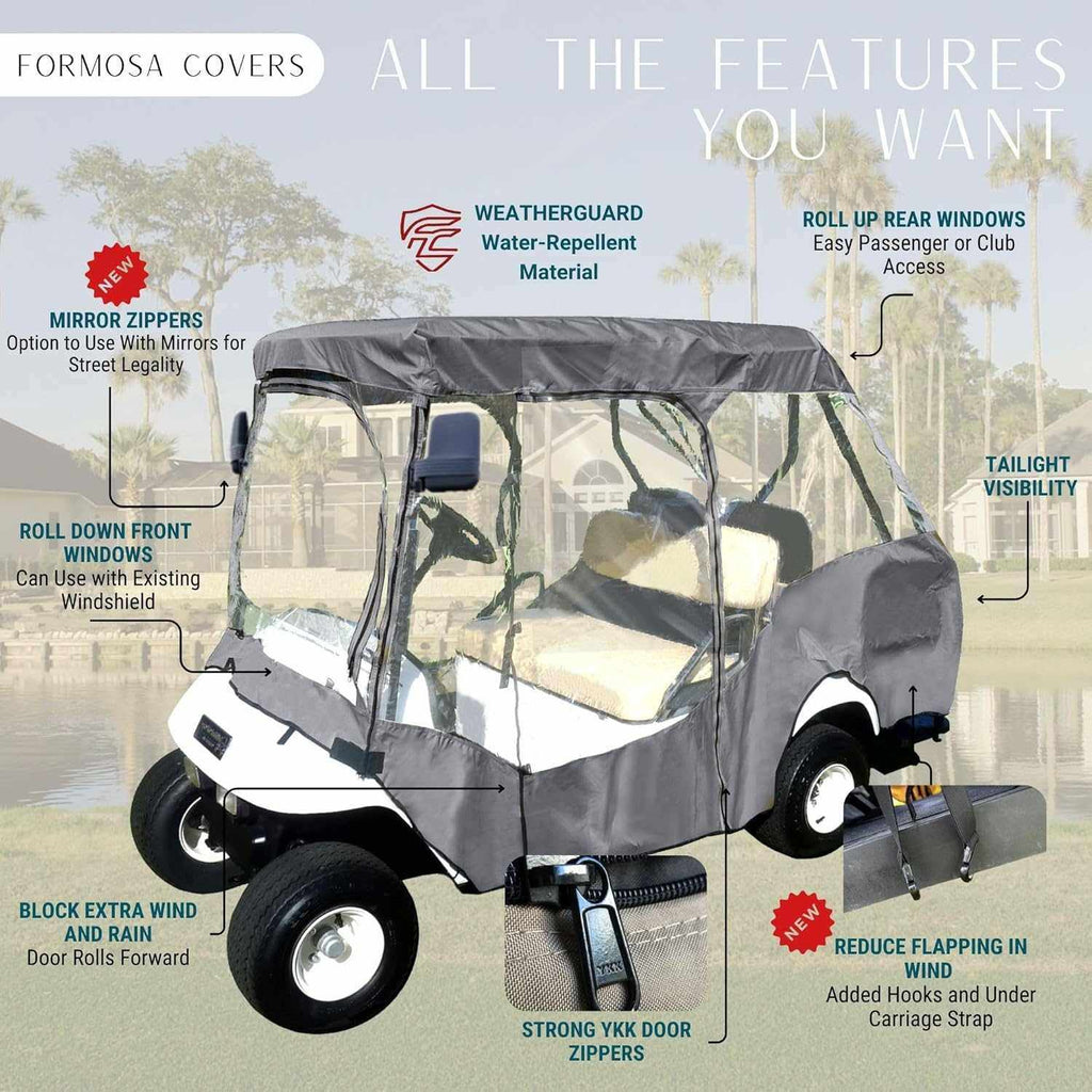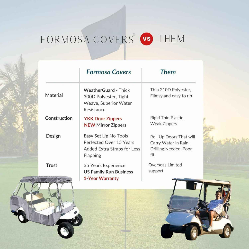 Experience Comfort on Your Golf Cart: Tired of chilly winds and rain while driving your golf cart? Stay warm and dry this season with the Formosa Covers Golf Cart Enclosure Cover. Our product has been perfected over 11 years, so you can trust in its tested product engineering.
