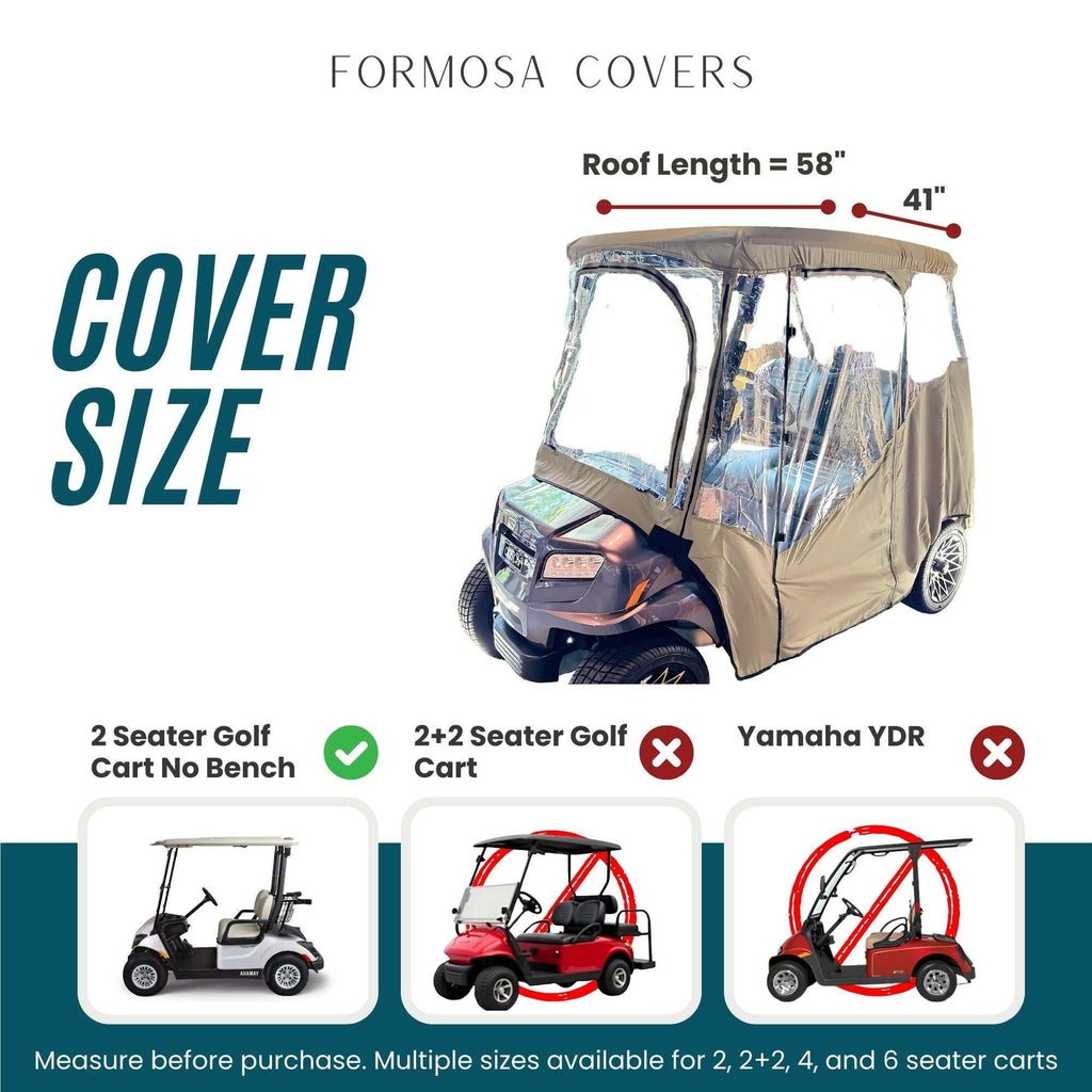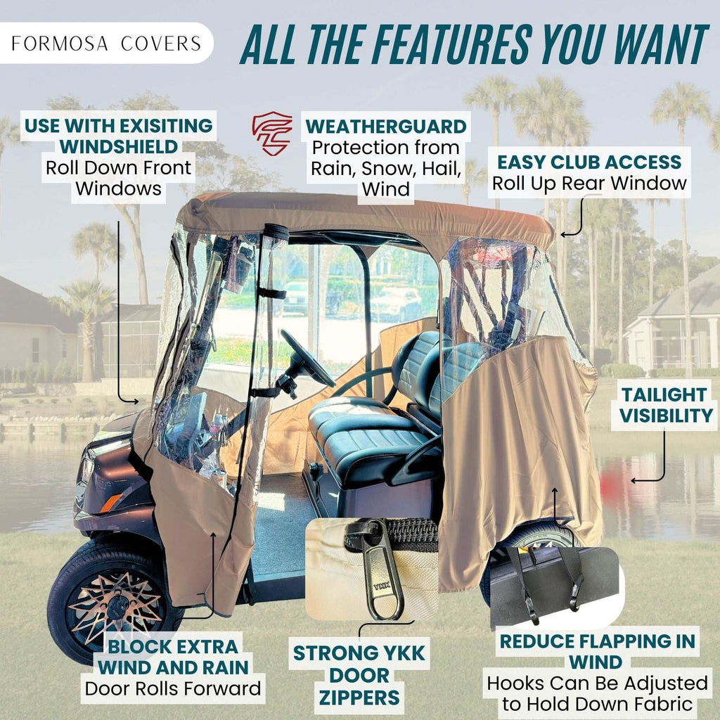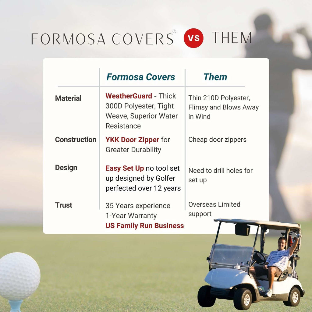 Drive Protected—Rain or Shine with an all-weather golf cart cover. For over three decades, Formosa Covers has been the trusted name in golf cart protection. Our driveable golf cart enclosure covers are engineered for real-world use, offering full coverage from wind, rain, and cold while maintaining crystal-clear visibility and easy access.