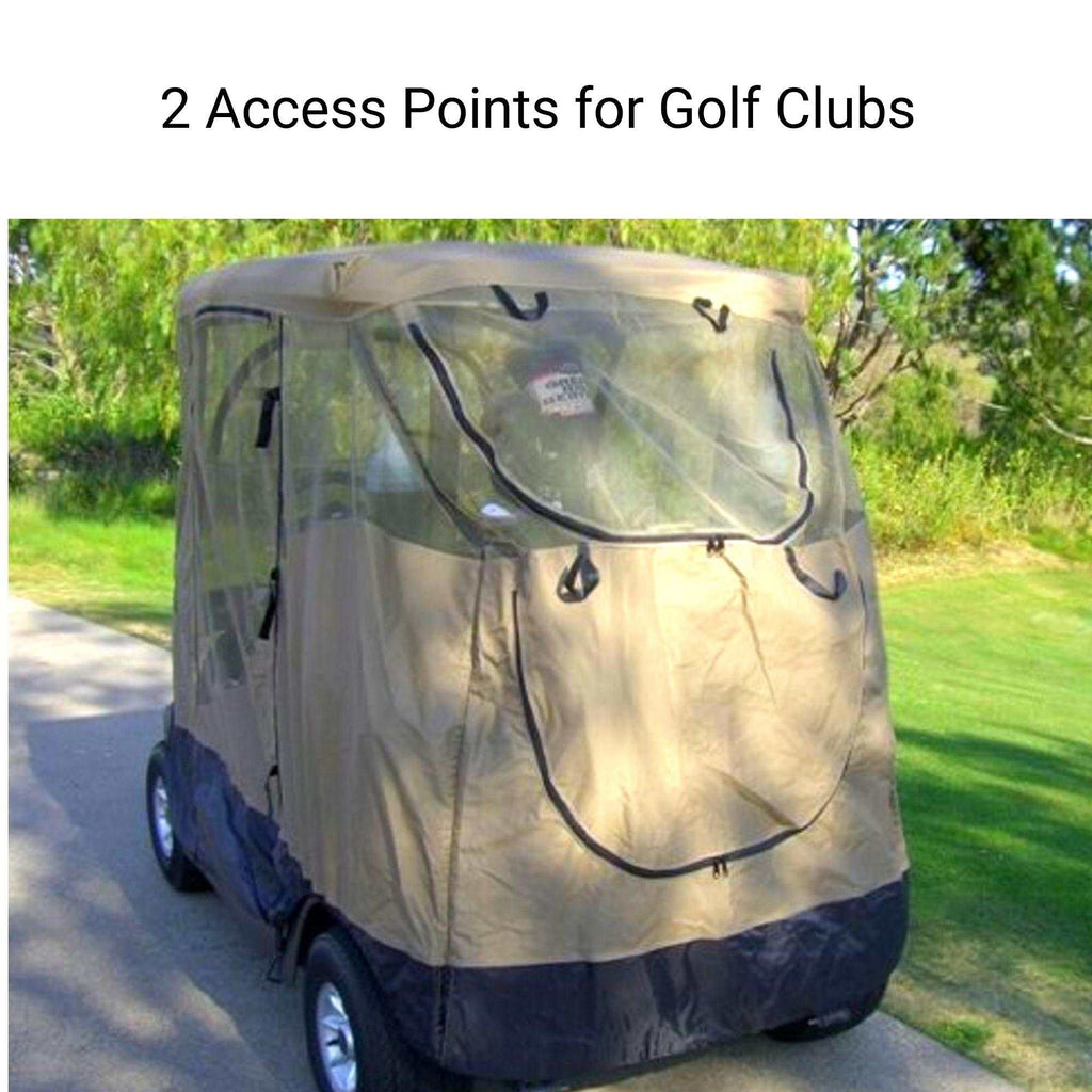 DESIGNED BY AVID GOLFER: Zipper on rear side for easy access to clubs. You can zip or unzip the front window to use with your existing windshield. Both sides have a commercial grade zipper door so players can enter from either side.
