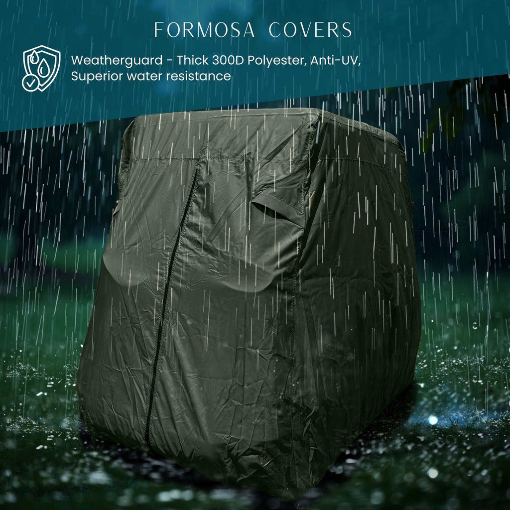 - Elastic hem on the bottom, Reinforced Grommets for snug fit, Rear zipper down the center for easy access