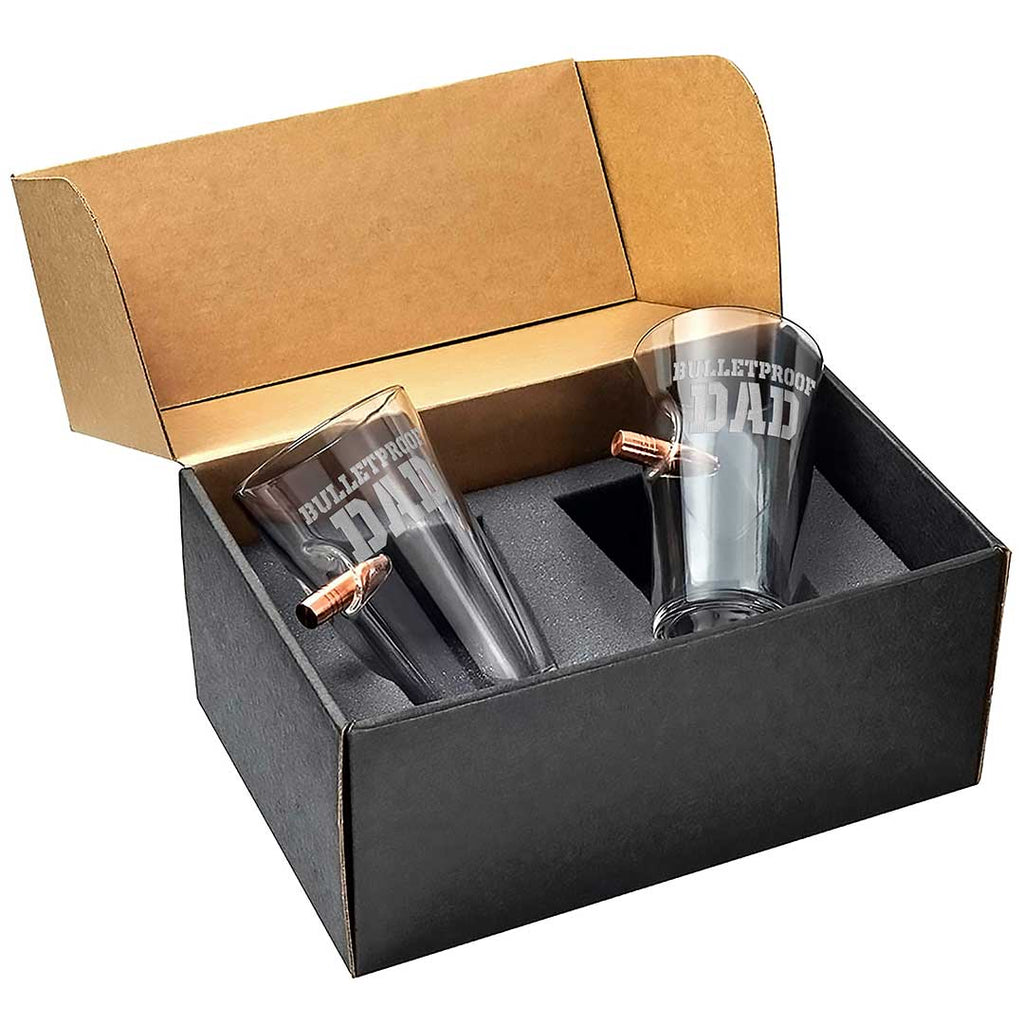 Our "Bulletproof Dad" glasses are hand-embedded with real, lead-free bullets. Each glass is high-quality, unique, and handcrafted in our glass workshop in Wisconsin.