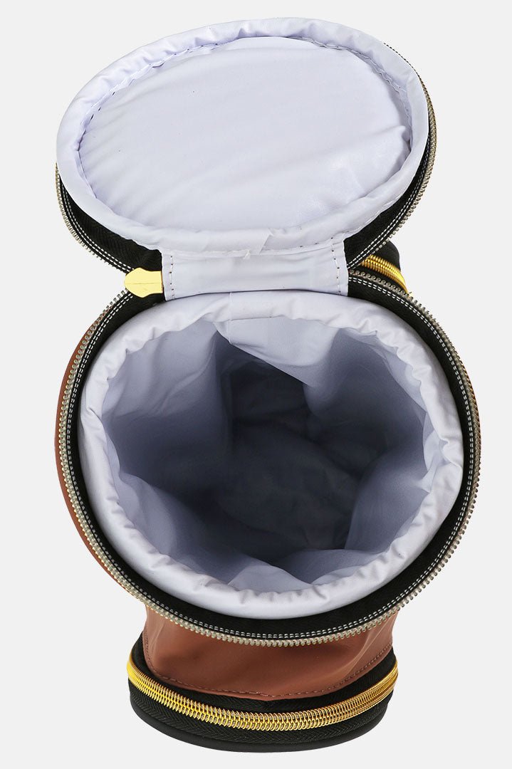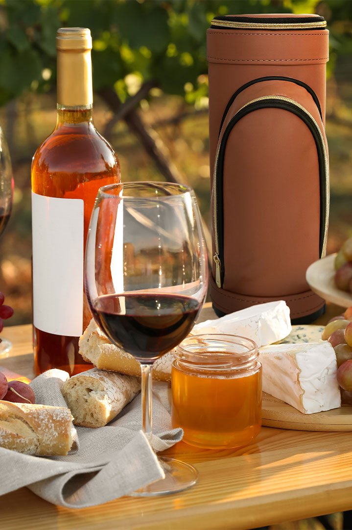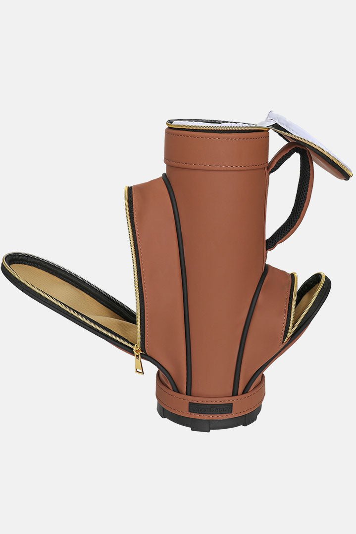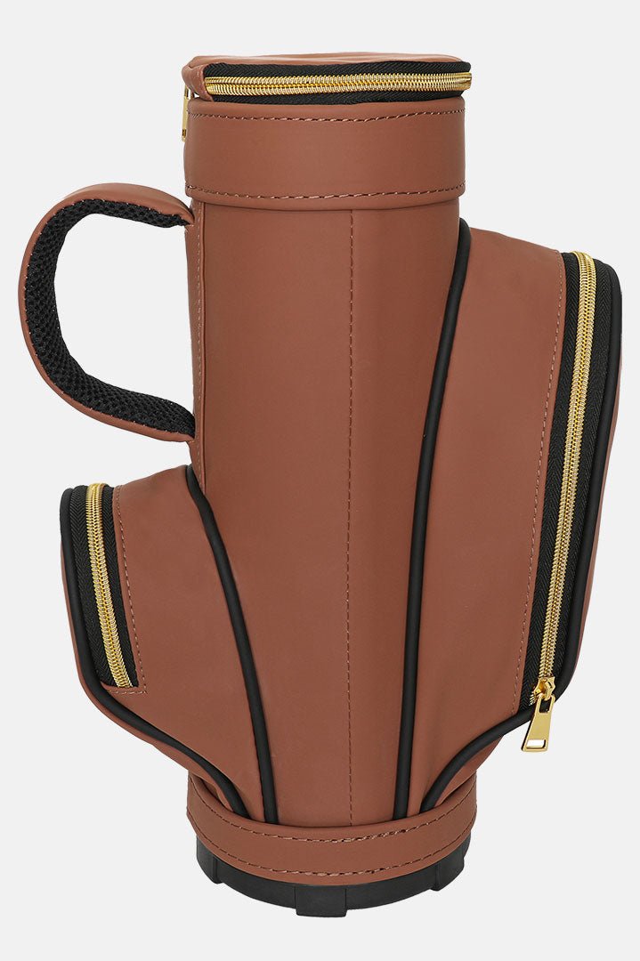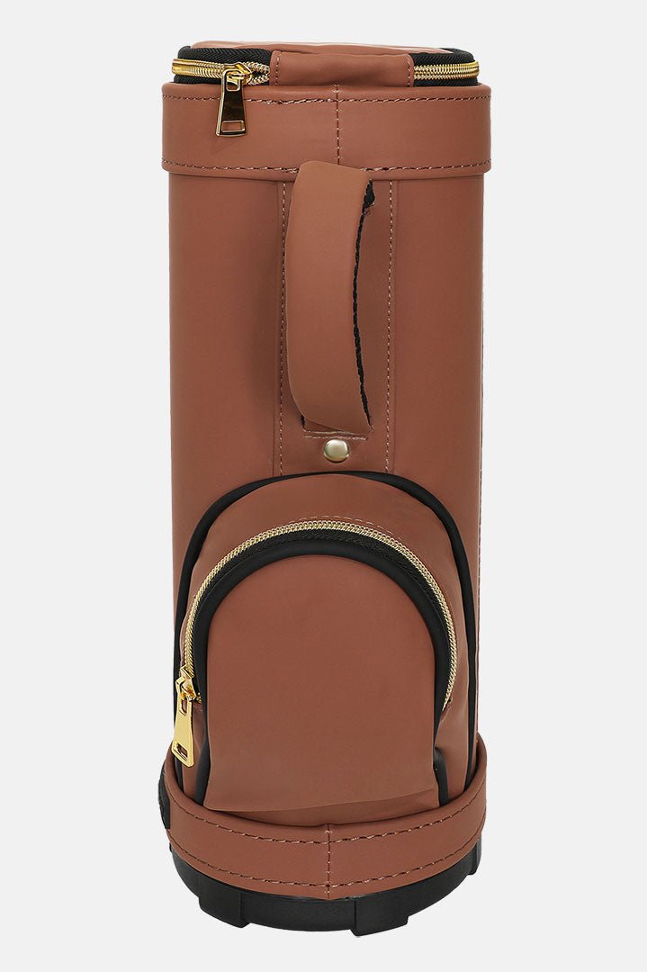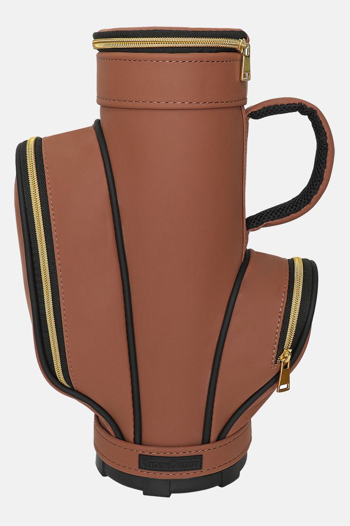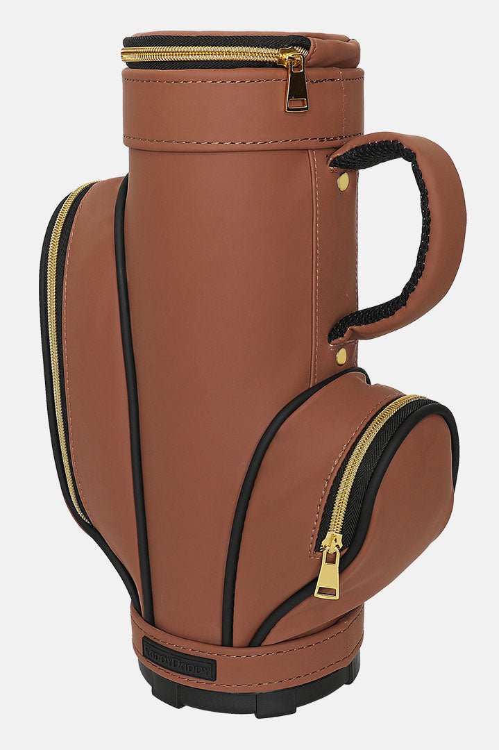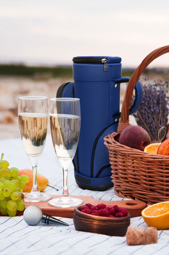 Our Premium Synthetic Leather Wine Golf Cooler Bags are designed to keep wine or champagne chilled and ready to drink. The cooler was designed for golf enthusiasts and wine lovers, making it a versatile gift that embodies a seamless fusion of leisure and luxury. Encased in premium synthetic leather fabric, this chic accessory effortlessly exudes opulence and sophistication. It is ingeniously designed to cater to the needs of wine or champagne connoisseurs who appreciate the finer things in life. This versatile cooler is not just limited to style on the golf course; it's perfect for picnics, beach outings, BBQs, and any outdoor occasions where you want to enjoy chilled wine or champagne in style. Its smooth, polished appearance adds a touch of class to any occasion, whether you're teeing off on the fairway or gathering with friends at a picnic. The leather used is 100% faux, so it's vegan. It's a testament to our commitment to luxury, allowing you to indulge in the finest materials guilt free.