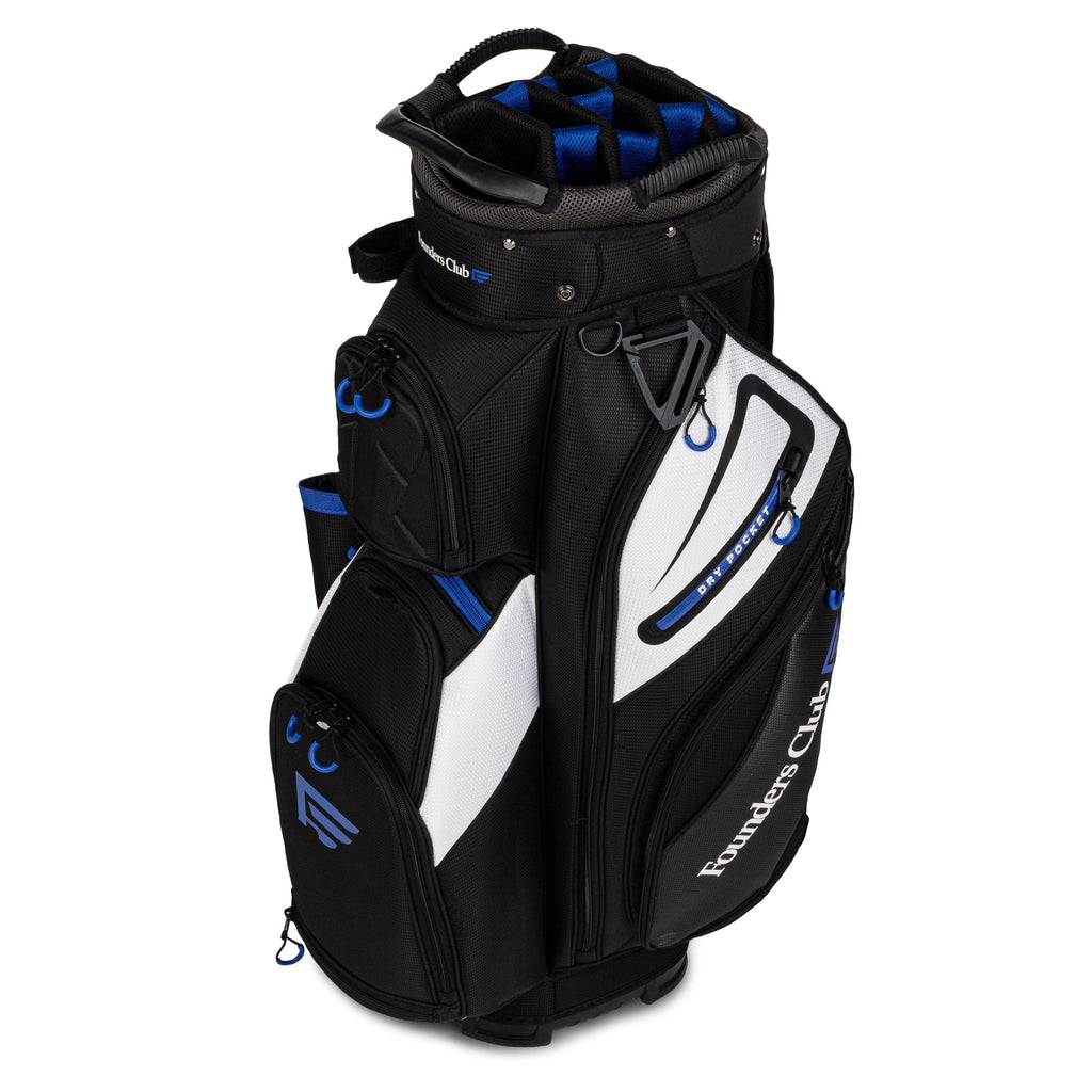 The Founders Club Colorado Cart Bag combines premium construction and accents whether you use a pushcart or ride in a cart. The 14 Way full length divider system makes it easy to pull your clubs out on an angled pushcart and helps keep your shafts and grips protected and untangled on a riding cart. The Colorado Cart Bag also includes a full-length rain cover to protect your clubs and your golf bag from getting wet while walking in the rain. The slot base design helps secure your golf bag to your pushcart so that your equipment investment is protected. Plus, The Founders Club Colorado Cart Bag has all the other features you would expect from a premium golf bag at a fantastic price:
