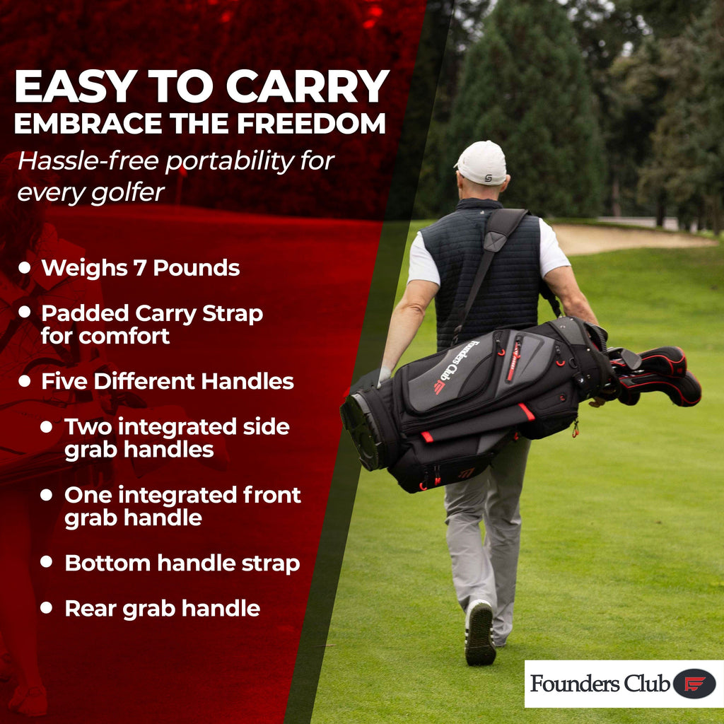 - Easy to Handle- This bag weighs in at 7 pounds and has 5 different handles to make getting the bag out of your car and onto your cart a breeze. The bag comes with 2 integrated side and one integrated front grab handles, a bottom handle strap, and a rear grab handle. The single padded carry strap helps you comfortably carry your bag on and off the course.