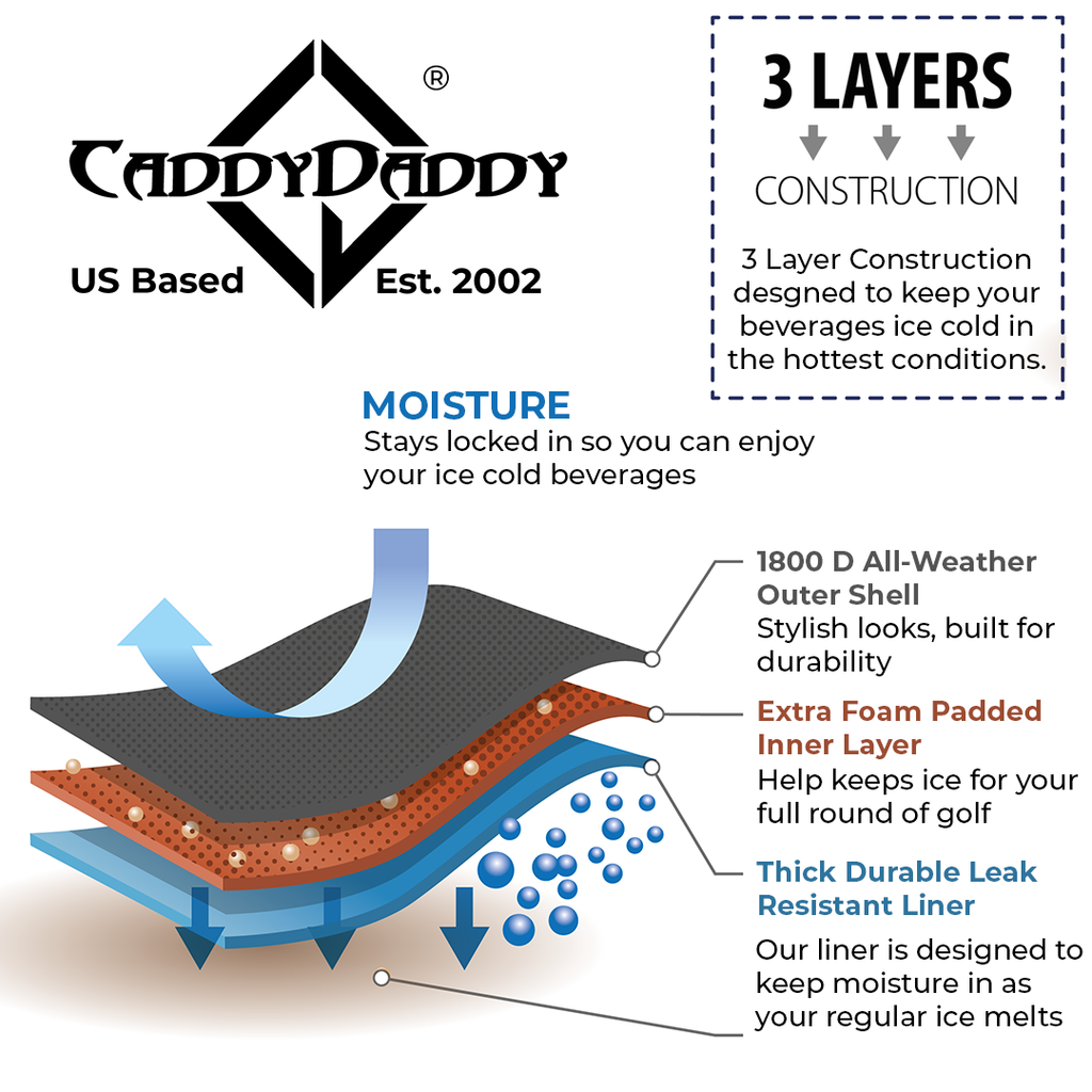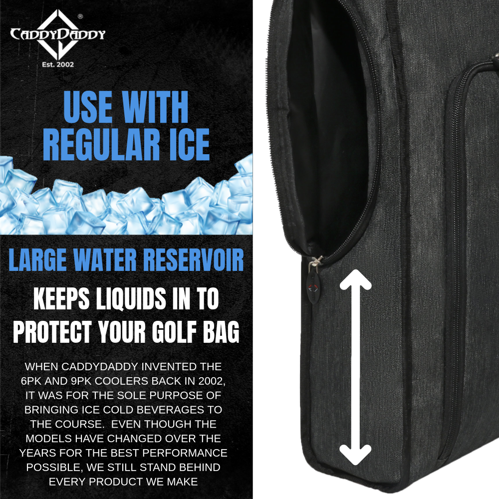 The original CaddyDaddy 9 pack and 6 pack golf bag beer and beverage coolers are designed for all golf bags including small stand bags. Each bag has a thick cooler lining, so just put in regular ice to keep your beverages ice cold. At CaddyDaddy we have been making golf coolers for over 20 years that have helped countless golfers save on their favorite beverages. The cooler keep beverages ice cold for a full round so your drinks will stay cold throughout your game. It's designed for long-term use with durable insulated liner, padded shoulder strap and heavy-duty zippers.