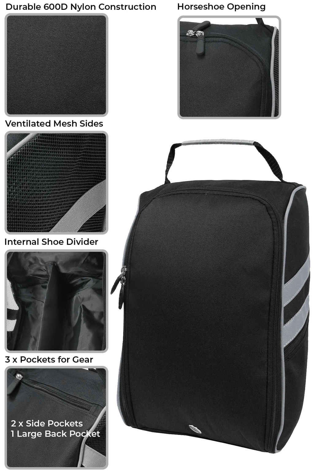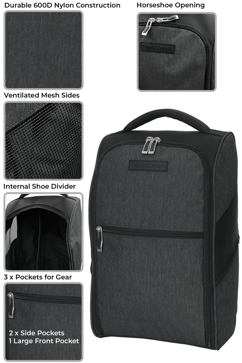 CaddyDaddy shoe bags are the perfect way to keep your golf shoes scuff free while transporting essential golf accessories. The large side pockets have plenty of room for golf balls, tees, gloves, divot tools and more. There’s even extra room for range finders or other accessories. The oversized back pocket on the Modern Shoe Bag can even carry a box of a dozen golf balls.