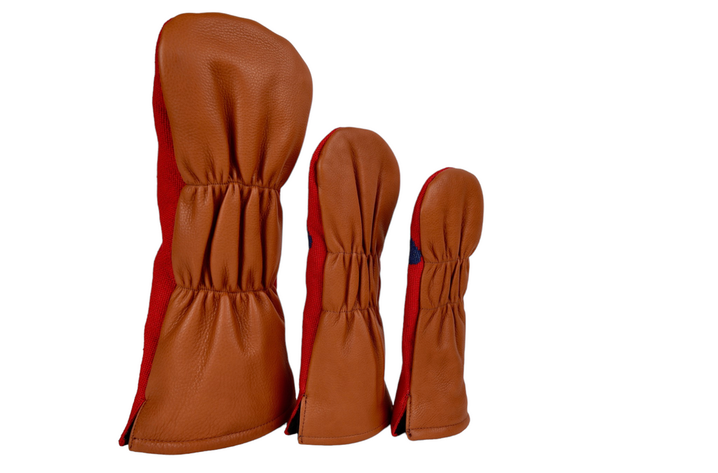 The ultimate headcover for your Driver, Fairway Woods and Hybrids. We went all out with the design and materials on these hand stitched needlepoint wood headcovers and it shows. We started with a full front hand stitched needlepoint exterior. From there we through caution to the wind and chose the best quality full grain leather available for the backing. Add in premium anti pill ultra soft fleece for the interior and the end result is something that oozes premium quality and craftsmanship.