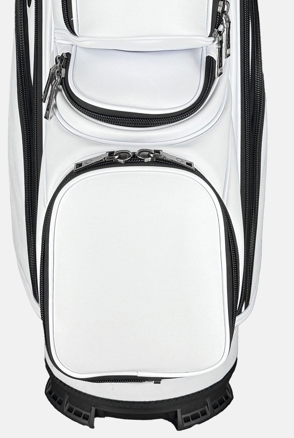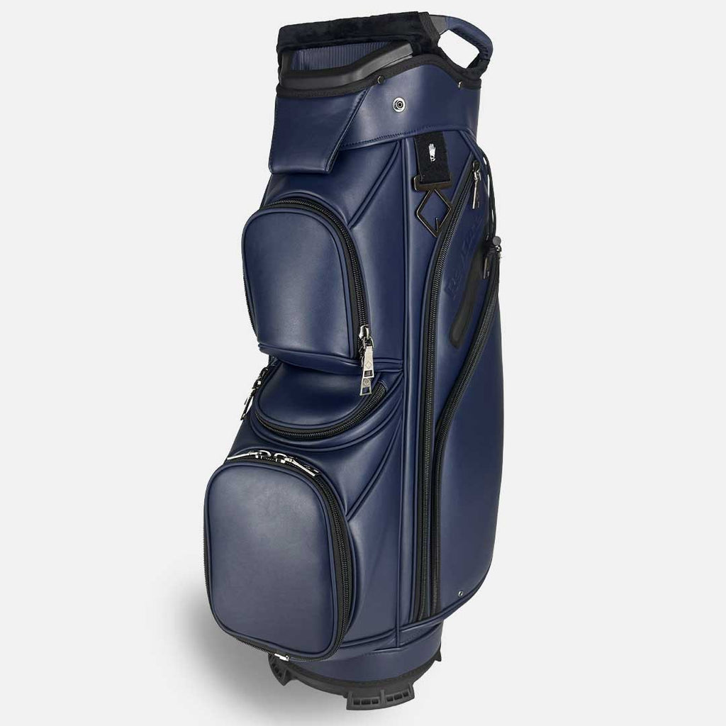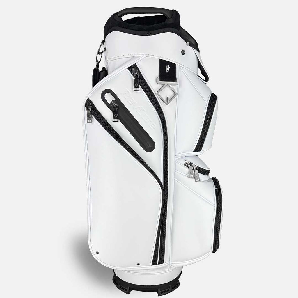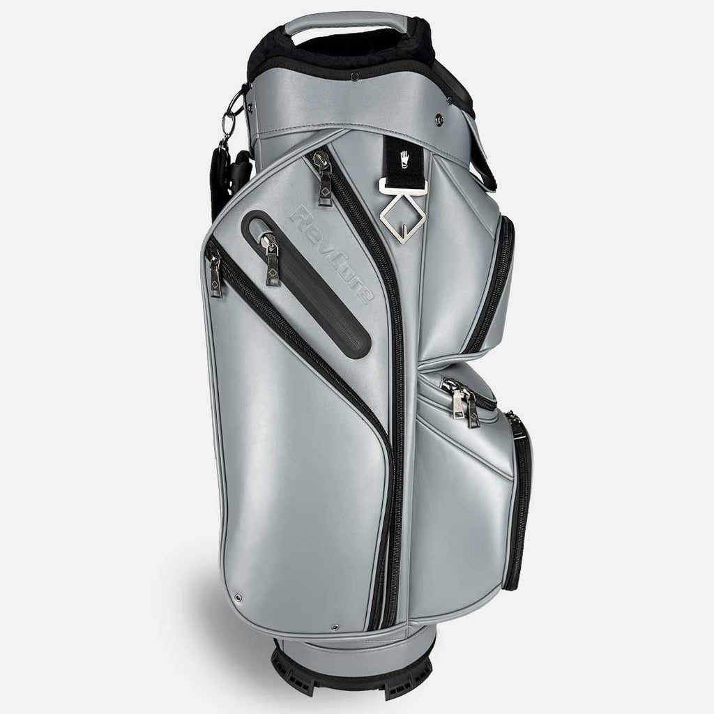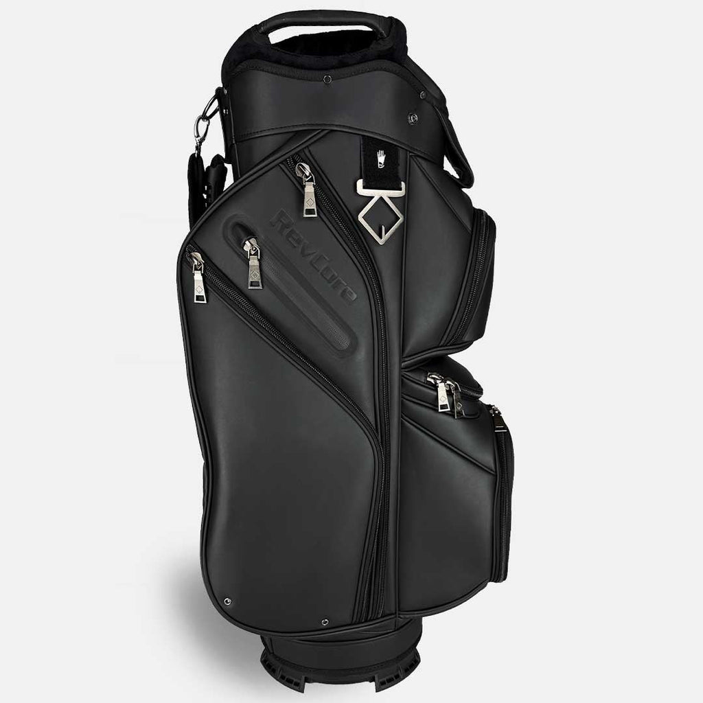 RevCore lux cart bags are crafted with foam backed tour-grade synthetic leather, oversized black alloy metal zippers and hardware with plenty of storage. Designed for golfers who predominantly use carts or push carts, the updated design features 14 way fully enclosed dividers, classic colorway options and a large putter well with no-ledge liner for large putter grips. Every inch of the new design has been improved with subtle color-matched logos, custom towel rings with glove holders and an integrated lower handle. The velvet-lined 14-way top with oversized putter well, provides maximum protection and organization for easy club access. The stay-flat base ensures your bag remains upright on any surface.