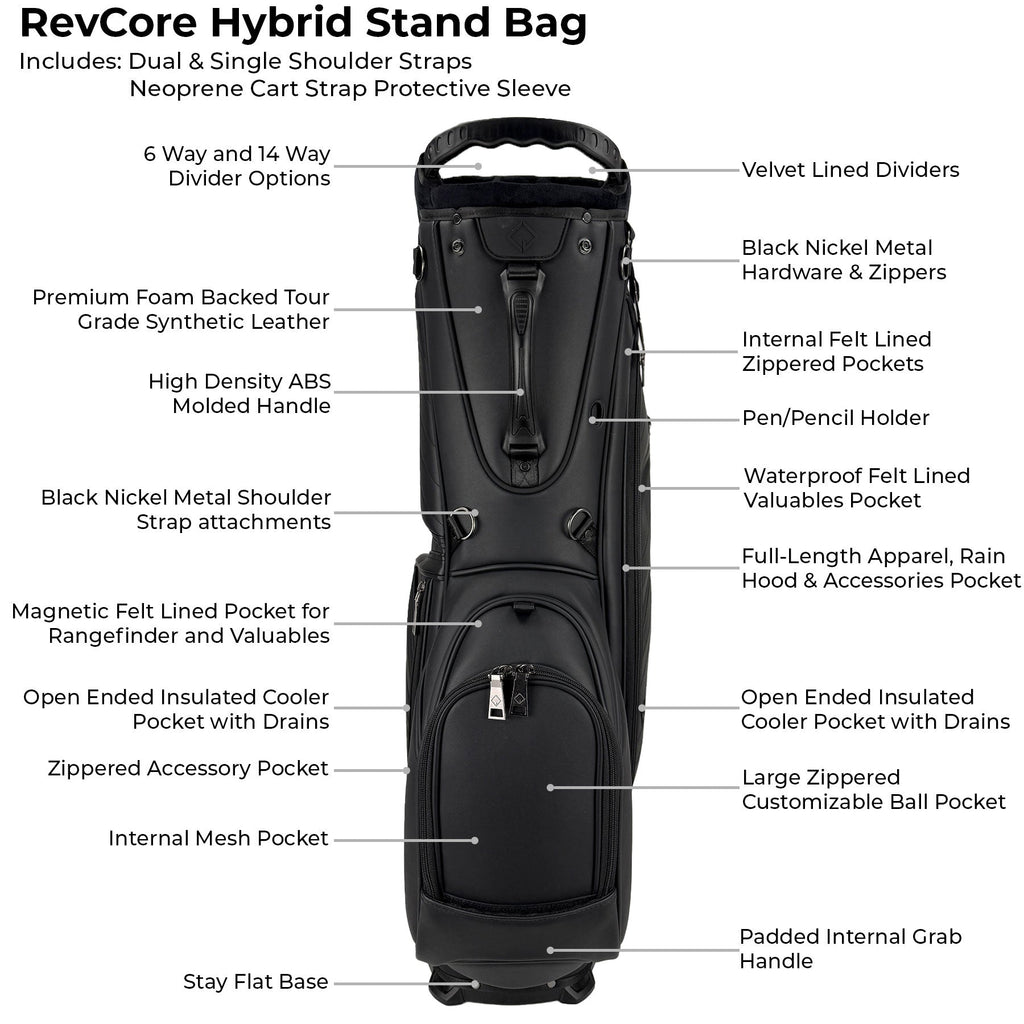 Quality: RevCore lux hybrid golf bags are crafted with superior hardware, materials, and features. From our premium foam-backed tour-grade synthetic leather to our black nickel alloy hardware and oversized custom black alloy zipper pulls, every detail is designed for durability and style. The heavily padded shoulder straps and ABS molded ergonomic carry handle ensure that comfort and sturdiness go hand-in-hand. Review our bag comparison guide to view the craftsmanship that sets us apart.